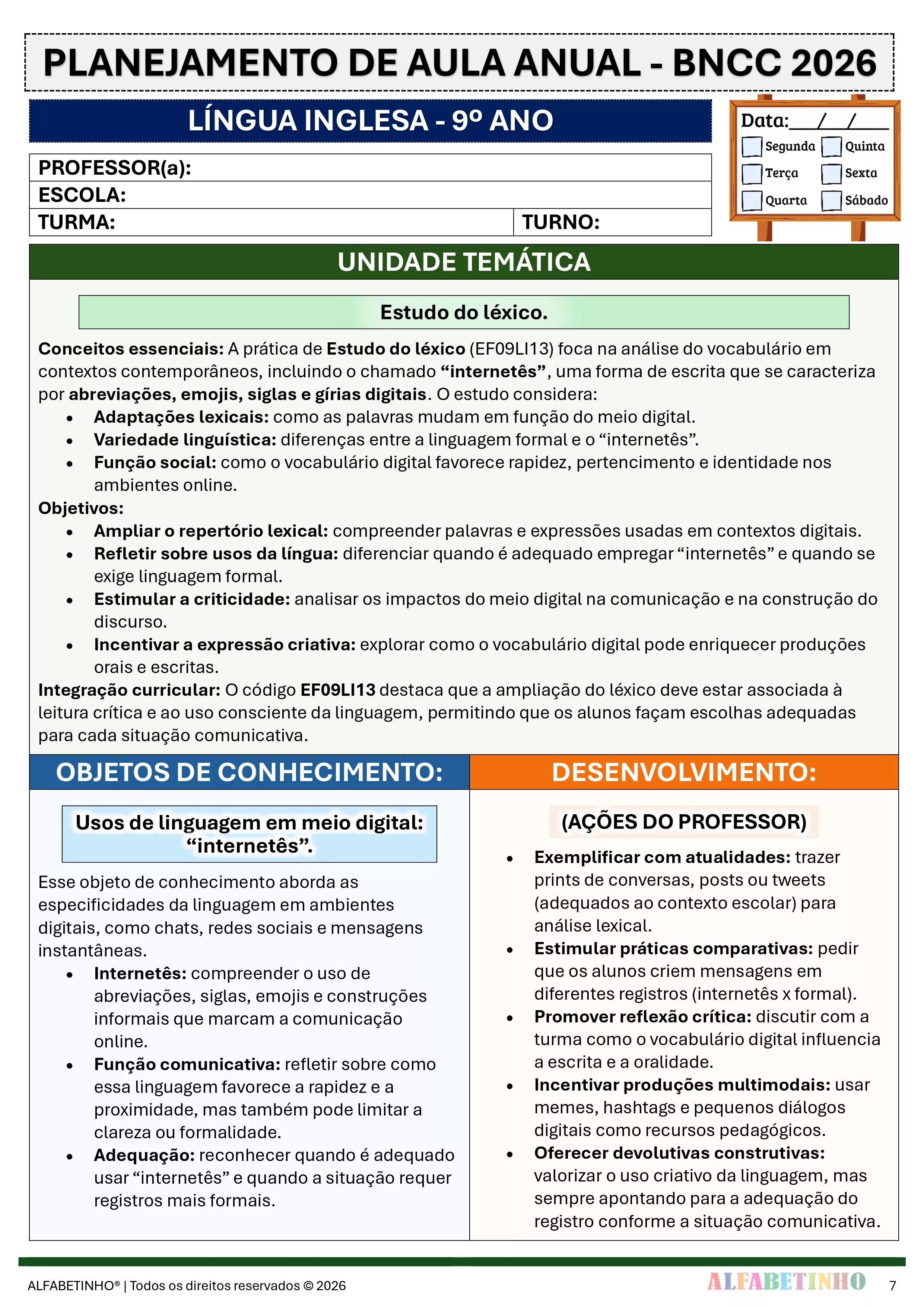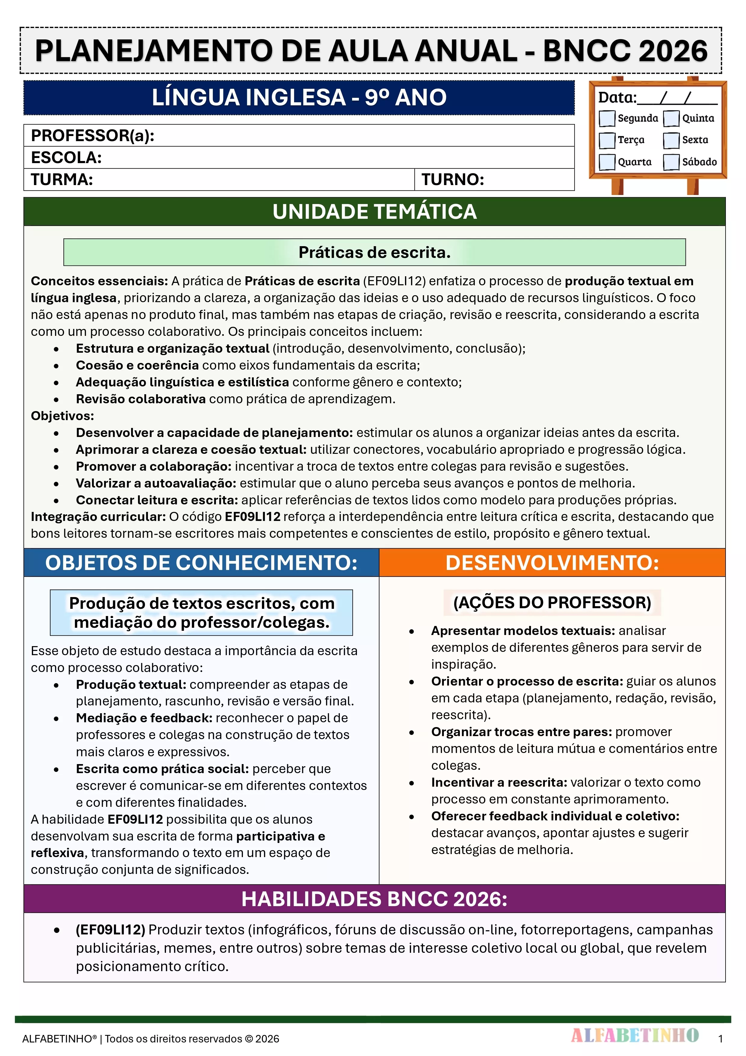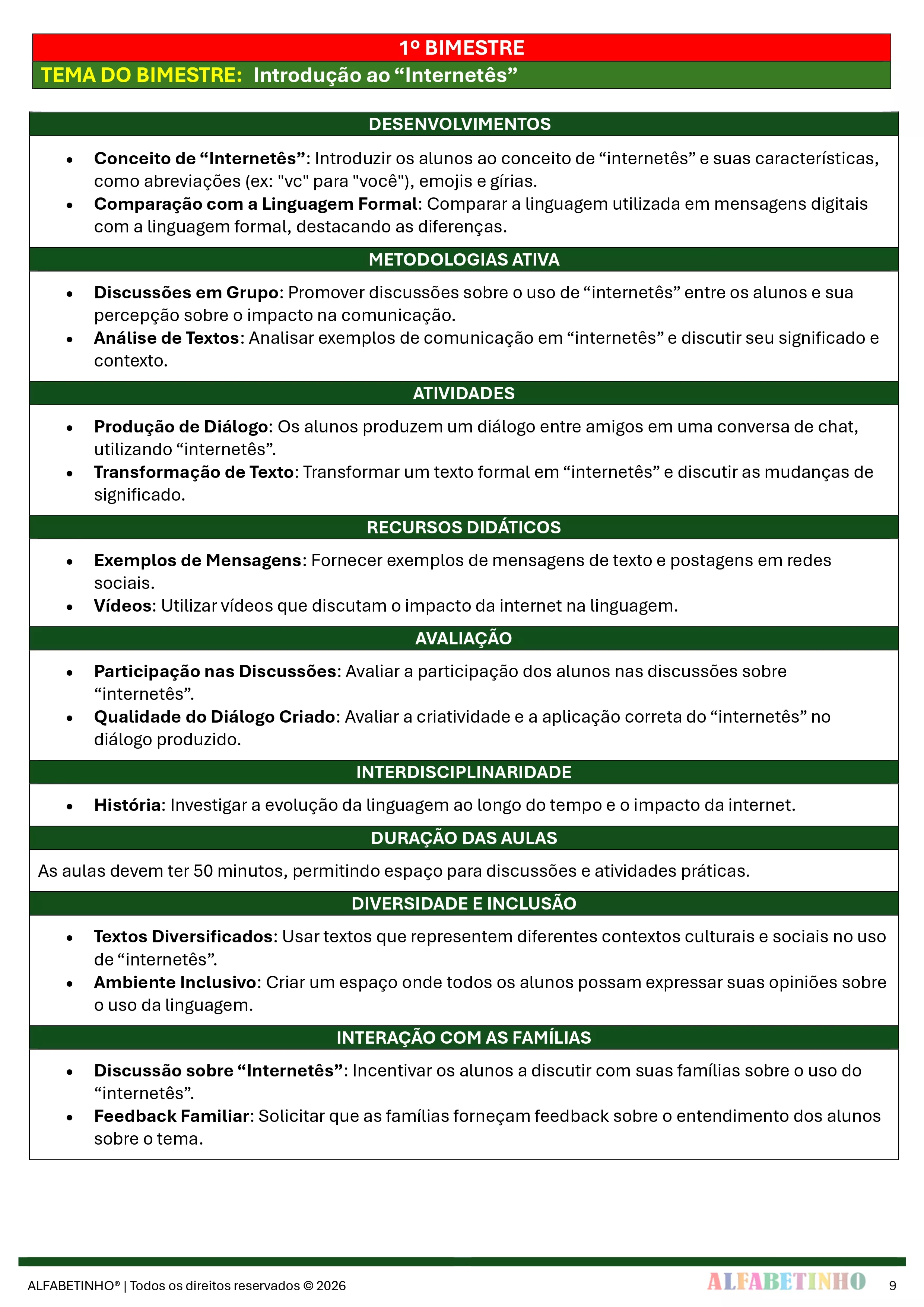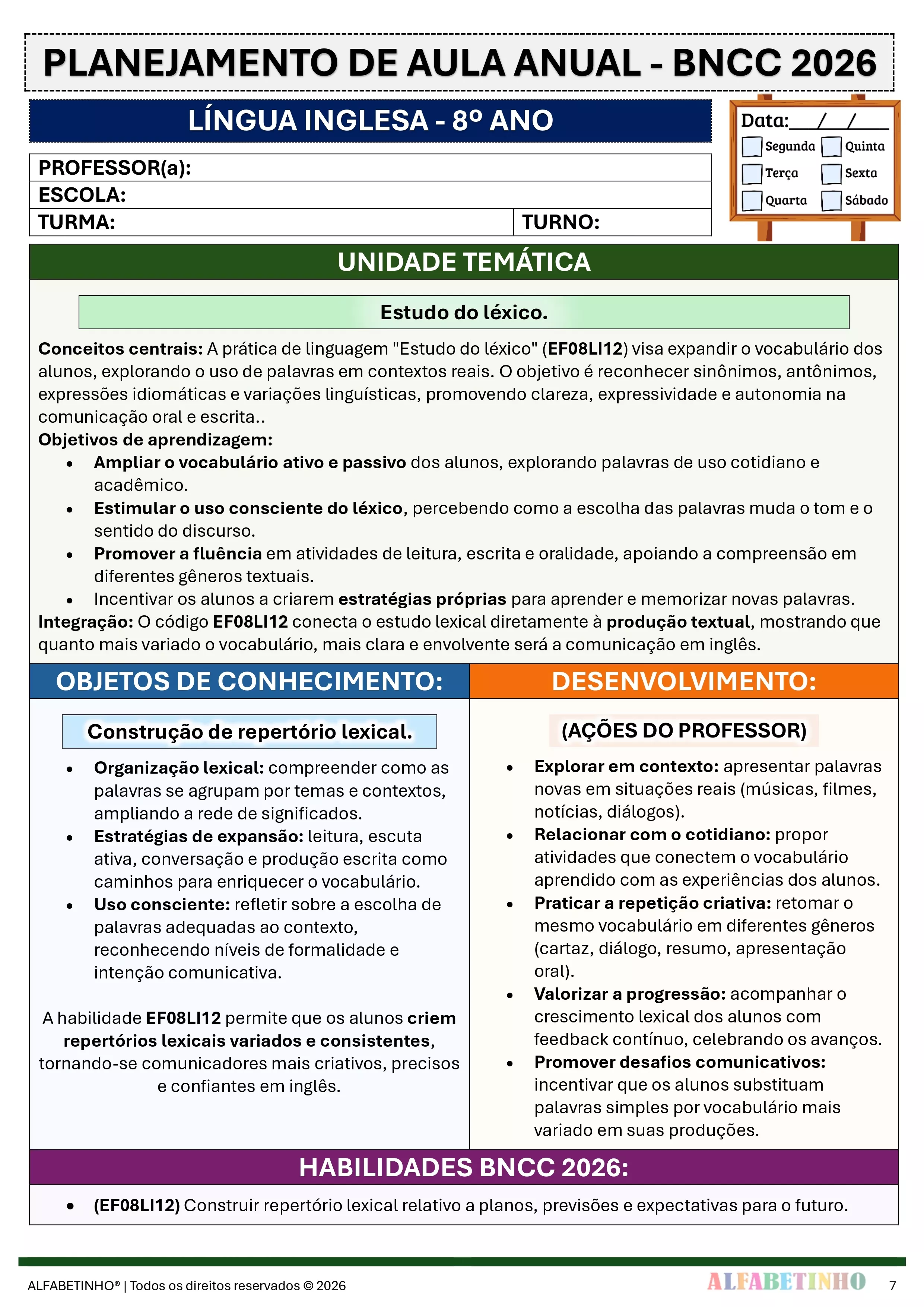 Desenvolvido com base nas diretrizes da Base Nacional Comum Curricular 2026, garantindo o alinhamento com as exigências educacionais atuais.