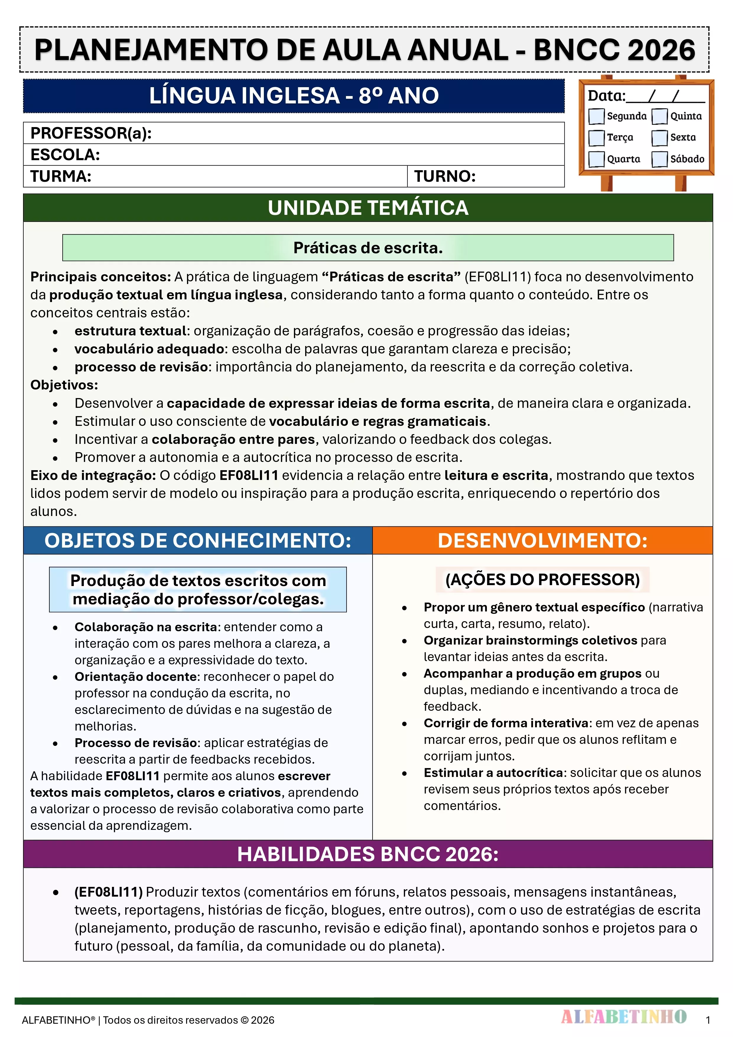 BNCC 2026, totalmente editáveis no Word e adaptáveis à sua realidade escolar. Praticidade, qualidade e inspiração para professores que amam ensinar!