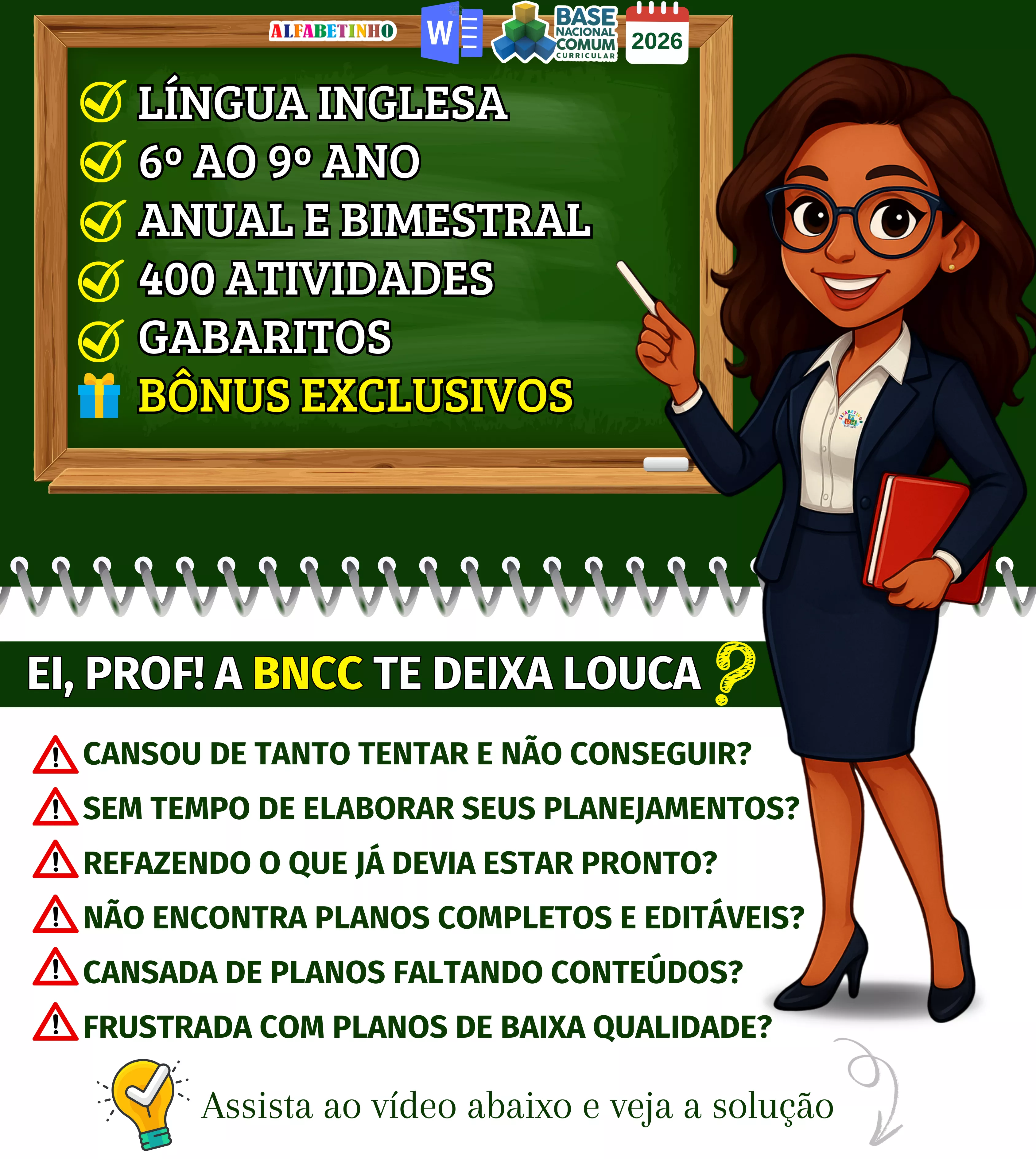 Planejamentos e atividades anuais e bimestrais completos, atualizados conforme a BNCC 2026, totalmente editáveis no Word e adaptáveis à sua realidade escolar. Praticidade, qualidade e inspiração para professores que amam ensinar!
