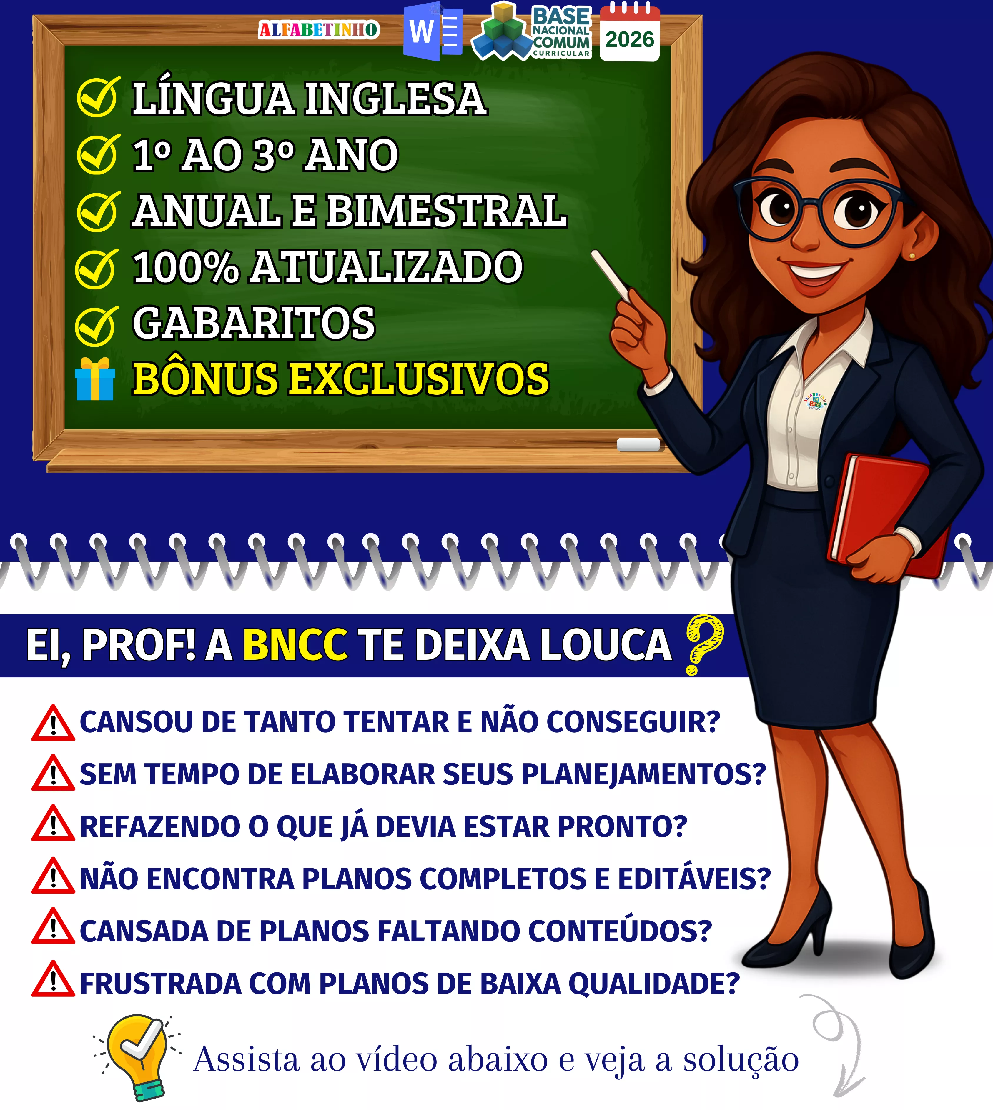 Planejamentos anuais e bimestrais completos, atualizados conforme a BNCC 2026, totalmente editáveis no Word e adaptáveis à sua realidade escolar. Praticidade, qualidade e inspiração para professores que amam ensinar!